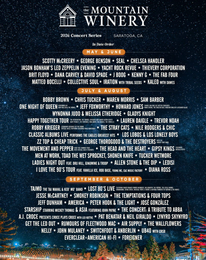 Perched high above Silicon Valley, the Mountain Winery is ready to soundtrack summer once again, and 2026 might be its most eclectic season yet. The historic venue has unveiled its 68th Summer Concert Series lineup, blending legacy icons with contemporary voices in a way that feels both curated and cinematic.