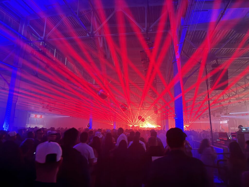 By the peak of the night, the transformation was complete. The row of disco balls hanging above the crowd, previously dim, came fully to life, casting light across the warehouse and signaling a shift into full stride. The room felt unified, with the energy no longer building but sustaining at a high level. Classic tracks drew strong reactions, and the space carried a communal, expressive feel that pushed the night forward without pause.