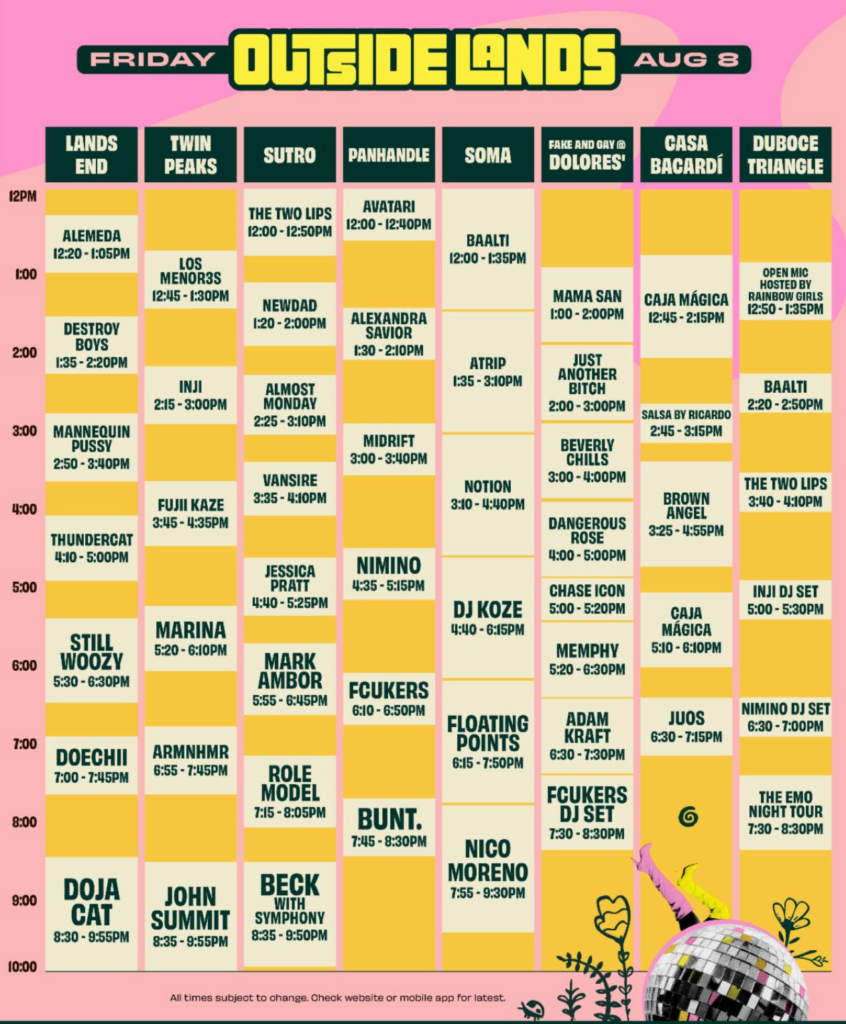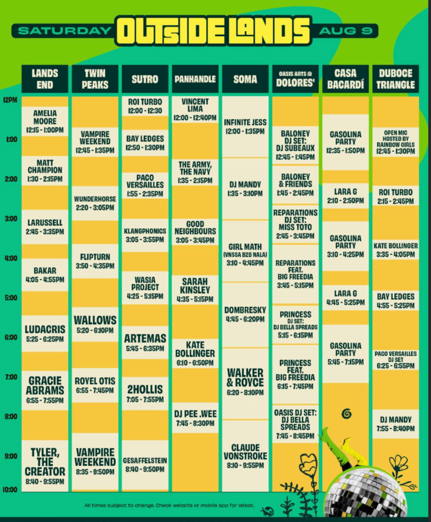 Outside Lands returns to Golden Gate Park August 8–10 with Tyler, The Creator, Hozier, and Doja Cat headlining. Set times are now live, and fans can build custom schedules using the Outside Lands app.
