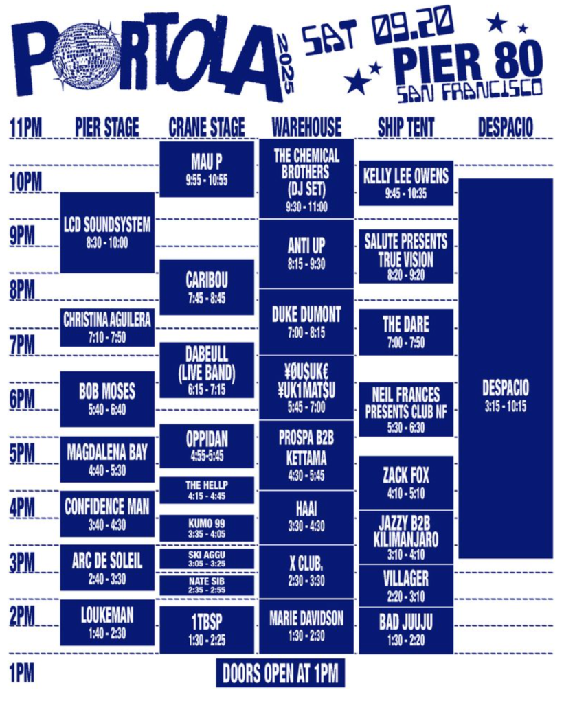 Portola has officially dropped the set times for its 2025 edition, happening September 20–21 at San Francisco’s PIER 80. This year’s powerhouse lineup includes LCD Soundsystem, Christina Aguilera, Dom Dolla, The Chemical Brothers (DJ set), Underworld, Peggy Gou, The Prodigy, Moby, and more. Making its San Francisco debut, James Murphy and 2ManyDJs’ immersive DESPACIO sound system will run all weekend long. From underground legends to pop icons, Portola 2025 is shaping up to be an unforgettable weekend for dance music lovers.